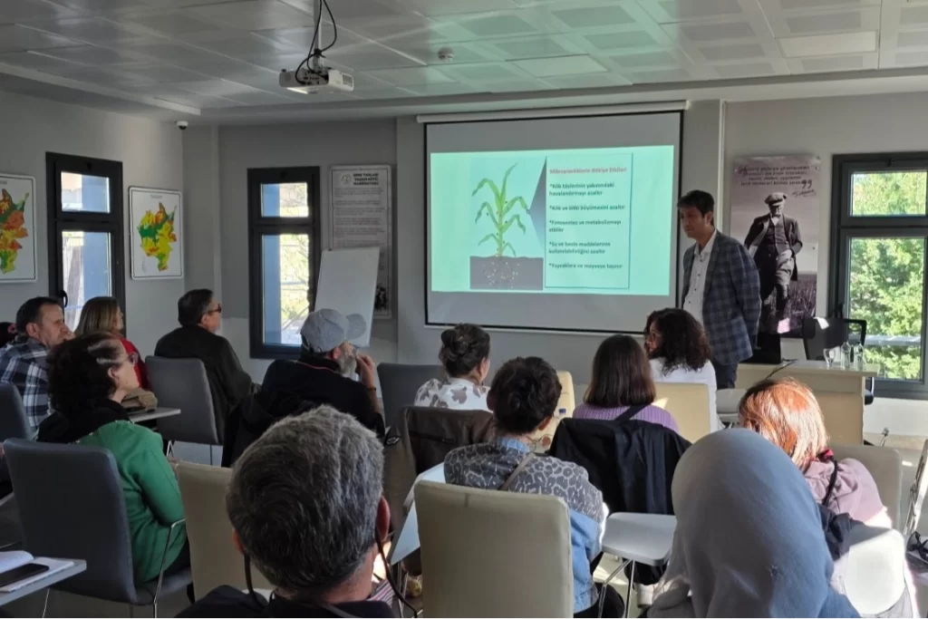Prof. Dr. Murat Yabanlı, “Plastik kirliliğinin tarımdaki örnekleri” hakkında Toprak Okulu’nda katılımcılara bir sunum yaptı. Yaptığı sunumda plastik kullanımı ve plastik atıklarının canlılar, toprak ve doğa üzerindeki etkileri hakkında bilgi veren Prof. Dr. Murat Yabanlı; “Türkiye 5,5 milyon ton plastik atık ile plastik kirliliği sıralamasında dünyada 9. sırada yer alıyor. Plastik, ucuz ve hafif olması nedeniyle gıda ambalajı olarak sıklıkla tercih ediliyor. Plastik aynı zamanda günlük hayatın ayrılmaz bir parçası olmuş durumda. Bir plastik poşetin 20 yılda yok olduğu söyleniyor ama yok oluş söz konusu değil aslında. Plastikler giderek ufak parçalara dönüşüyor en sonunda nano plastik parçalar kalıyor. Bu parçaların doğada hareketi devam ediyor. Gözle görülmeyen plastiklere mikro plastik adını veriyoruz. Her yıl 8 milyon ton plastik denizlere karışıyor. Denizlere karışan plastik denizlerdeki canlı yaşamını da olumsuz etkiliyor. Tüm bunların önüne geçmek için tek kullanımlık ürünleri hayatımızdan çıkarmalıyız. Plastik su şişeleri yerine matara kullanımı yaygınlaşmalı, geri dönüşüm bilinci kazandırılmalı. Plastik poşetler yerine bez torbalar kullanılmalı” bilgisini verdi.