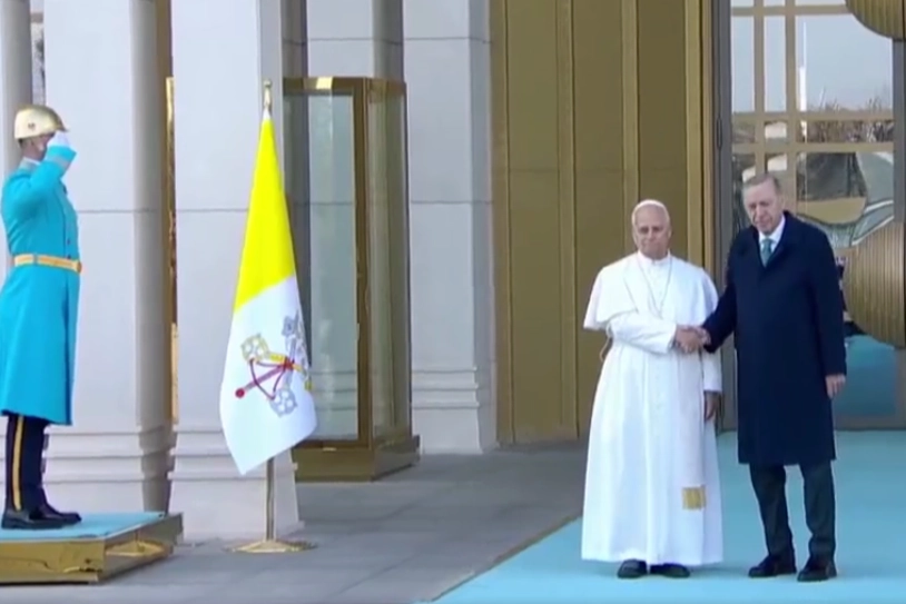 Cumhurbaşkanlığı Külliyesi’nde, Cumhurbaşkanı Erdoğan tarafından resmi törenle karşılanan Papa, Türkiye ile Vatikan bayrakları önünde tokalaşarak, basın mensuplarına poz verdi.