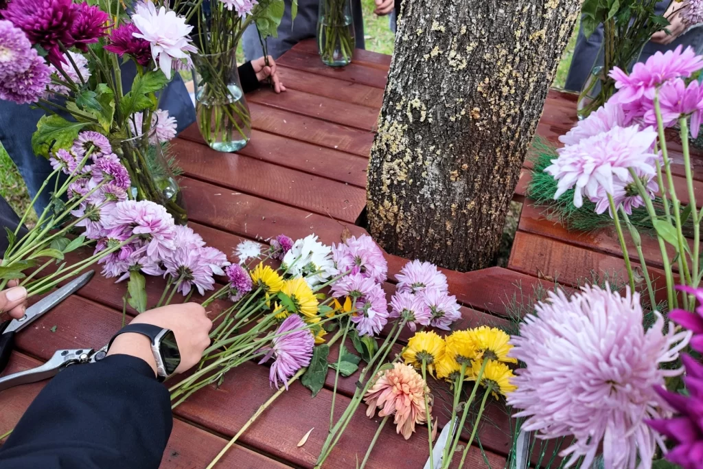 Ders sırasında kesme çiçekler, yeşillikler, tanzim kapları, çiçek makası, teller, kurdele, rafya, krepon kâğıdı gibi pek çok araç ve materyalin işlevi anlatıldı. Öğrenciler bu malzemeleri yakından tanıyarak kendi buket tasarımlarını uygulama fırsatı buldu. Bu kapsamda atölyede öğrenciler, birbirinden farklı kokulara sahip çiçekleri sevdiklerine hediye etmek için özenle hazırladı. Kimi öğrenciler eğitim sonunda yaptığı buketi annesine götürmeyi tercih ederken, kimileri ise öğretmenlerine hediye etmek için kendi tasarımlarını hazırladı.