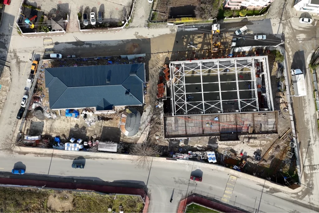 Modern mimarisi ve çok yönlü kullanım alanlarıyla proje 4 bin metrekare alan üzerine kurulacak yarı olimpik yüzme havuzunda betonarme kolon imalatları bitti, çelik çatı montajı ve duvar örüm işlemlerine geçildi.