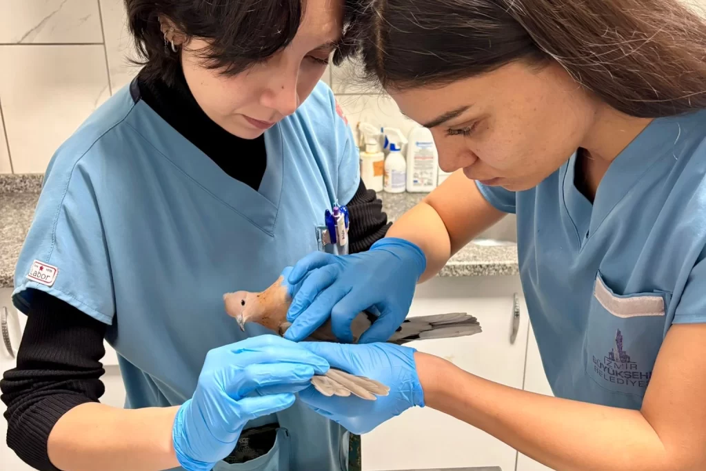 Güvercinin sağ kanadında açık yara ve sağ göz çevresinde travmatik bulgular tespit edildi. Kırık olmadığı saptanan güvercinin yaraları temizlenerek tedavisi yapıldı. Güvercin sağlığına kavuştuktan sonra Doğa Koruma ve Milli Parklar İzmir Şube Müdürlüğü’ne teslim edilecek.