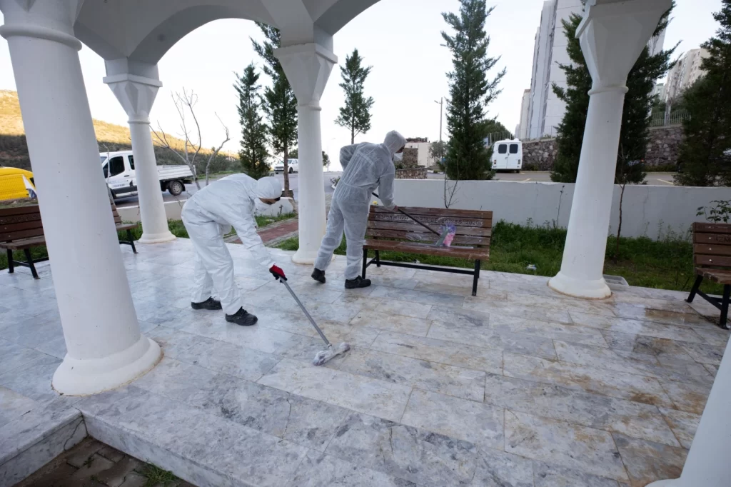 Park ve Bahçeler Müdürlüğü ile Temizlik İşleri Müdürlüğü ekiplerinin koordinasyonuyla yürütülen çalışmalar kapsamında cami avluları ve bahçeler titizlikle süpürüldü, yıkandı ve detaylı şekilde temizlendi.