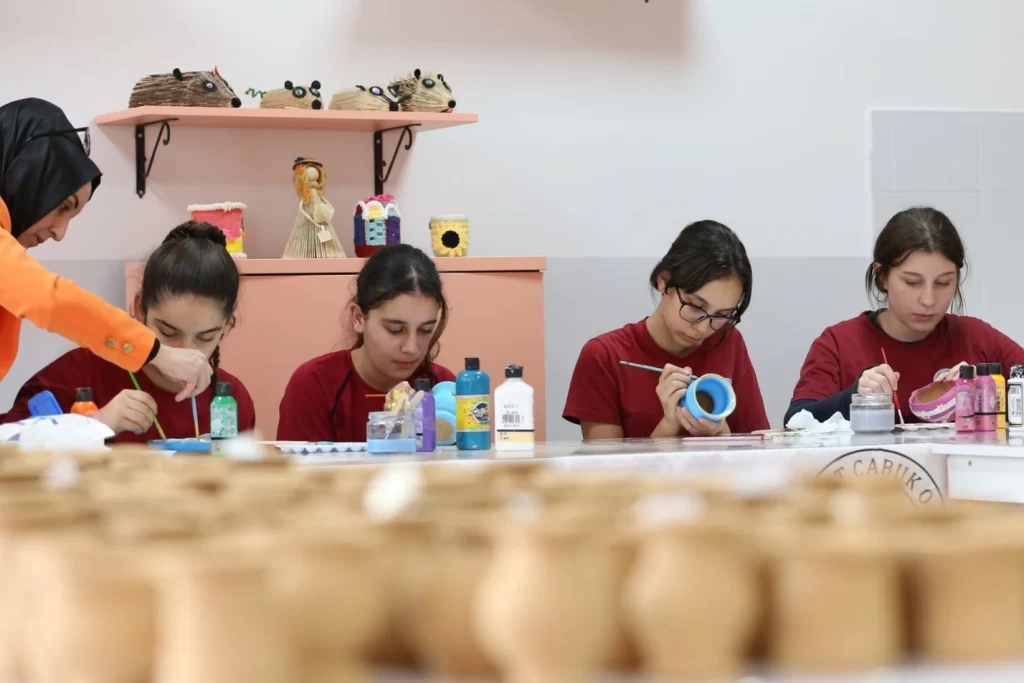 Bursa’nın Osmangazi ilçesinde geleneksel el sanatlarına yönlendirilen yaklaşık 10 bin öğrenci, yaptıkları çömlekleri boyayıp okullarında sergiliyor.
