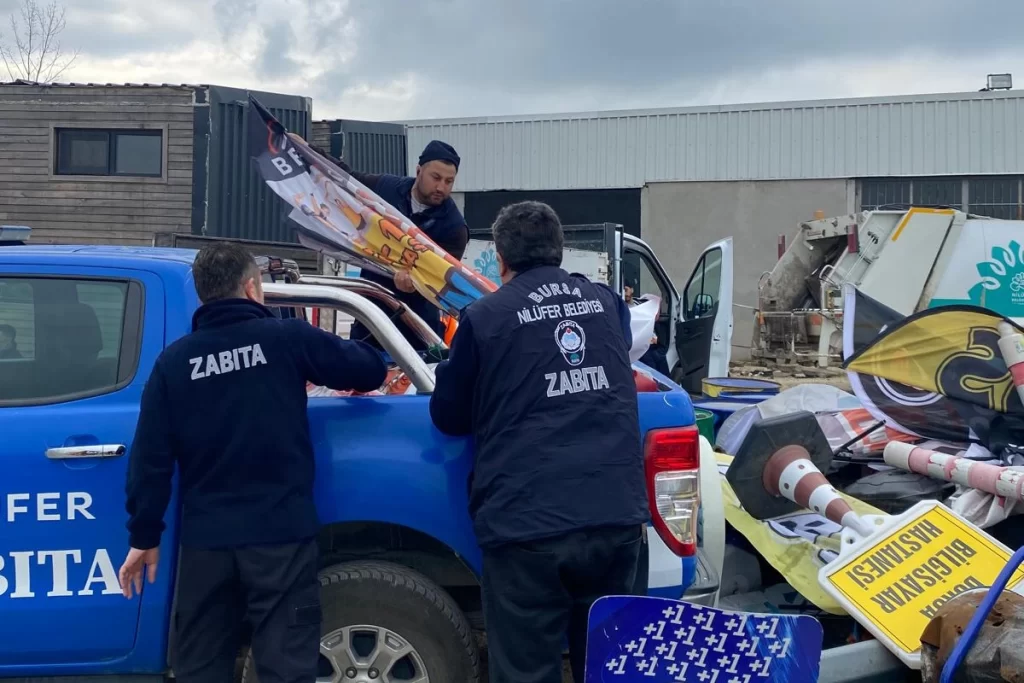 Bursa Nilüfer Belediyesi zabıta ekipleri, Görükle, Beşevler, 29 Ekim Mahallelerinde cadde ve kaldırımlarda yaya geçişini engelleyen duba, bayrak gibi materyalleri topladı.