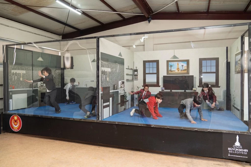 İzmir Büyükşehir Belediyesi İtfaiye Dairesi Başkanlığı bünyesinde geliştirilen Sanal Gerçeklik Tabanlı Deprem Simülasyonu, katılımcılara sarsıntı anını gerçeğe en yakın haliyle yaşatıyor.